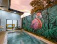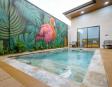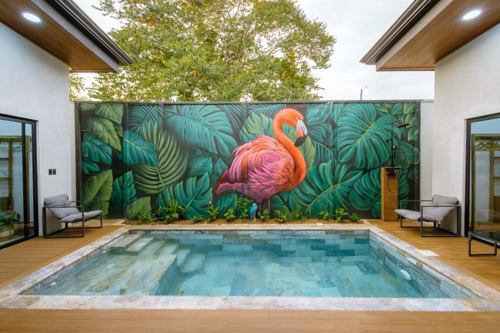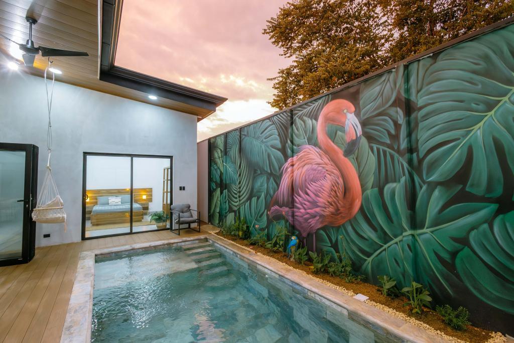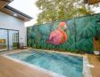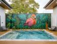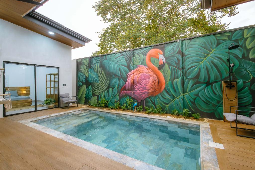 La piscina privada de varios niveles, con mural artesanal de artista local, es el corazón de la villa: las áreas sociales y dormitorios están distribuidos alrededor para disfrutar de vistas relajantes al agua desde casi cualquier punto.