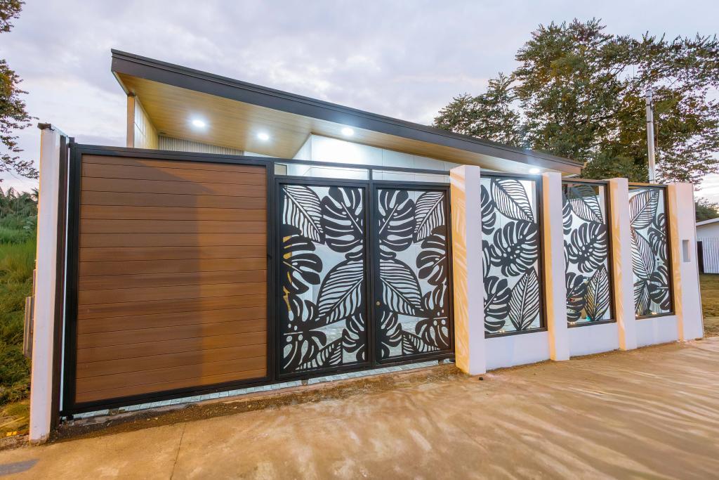 Desde el primer momento, Villa Serenity impresiona: acceso controlado con portón eléctrico, cerca de privacidad en acero artesanal local y estacionamiento pavimentado para dos vehículos grandes.