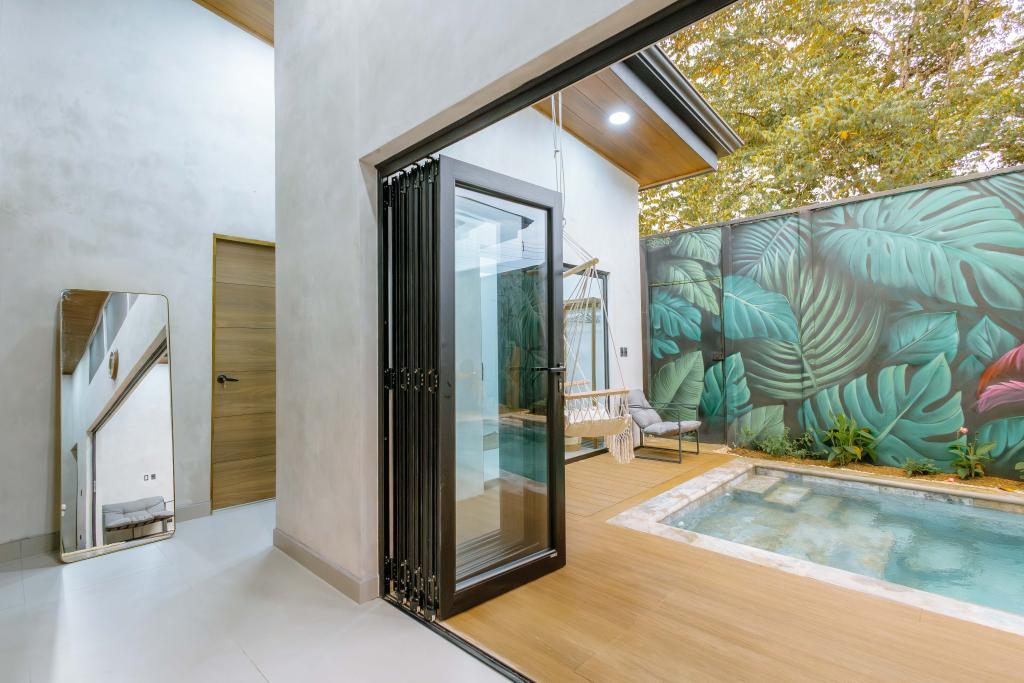La puerta principal es una obra de arte con sistema de apertura digital (tarjeta, código o llave), ofreciendo una llegada elegante y segura.El interior destaca por sus techos altos y una pared completa de puertas plegables que conecta sin interrupciones el espacio interior con el exuberante patio tropical.