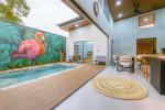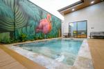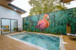 La piscina privada de varios niveles, con mural artesanal de artista local, es el corazón de la villa: las áreas sociales y dormitorios están distribuidos alrededor para disfrutar de vistas relajantes al agua desde casi cualquier punto.